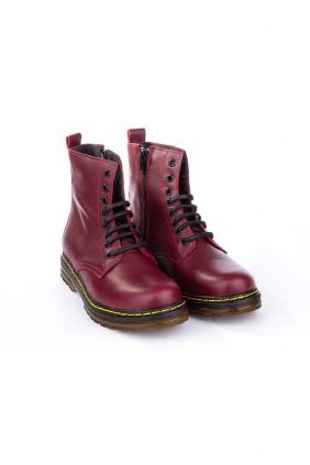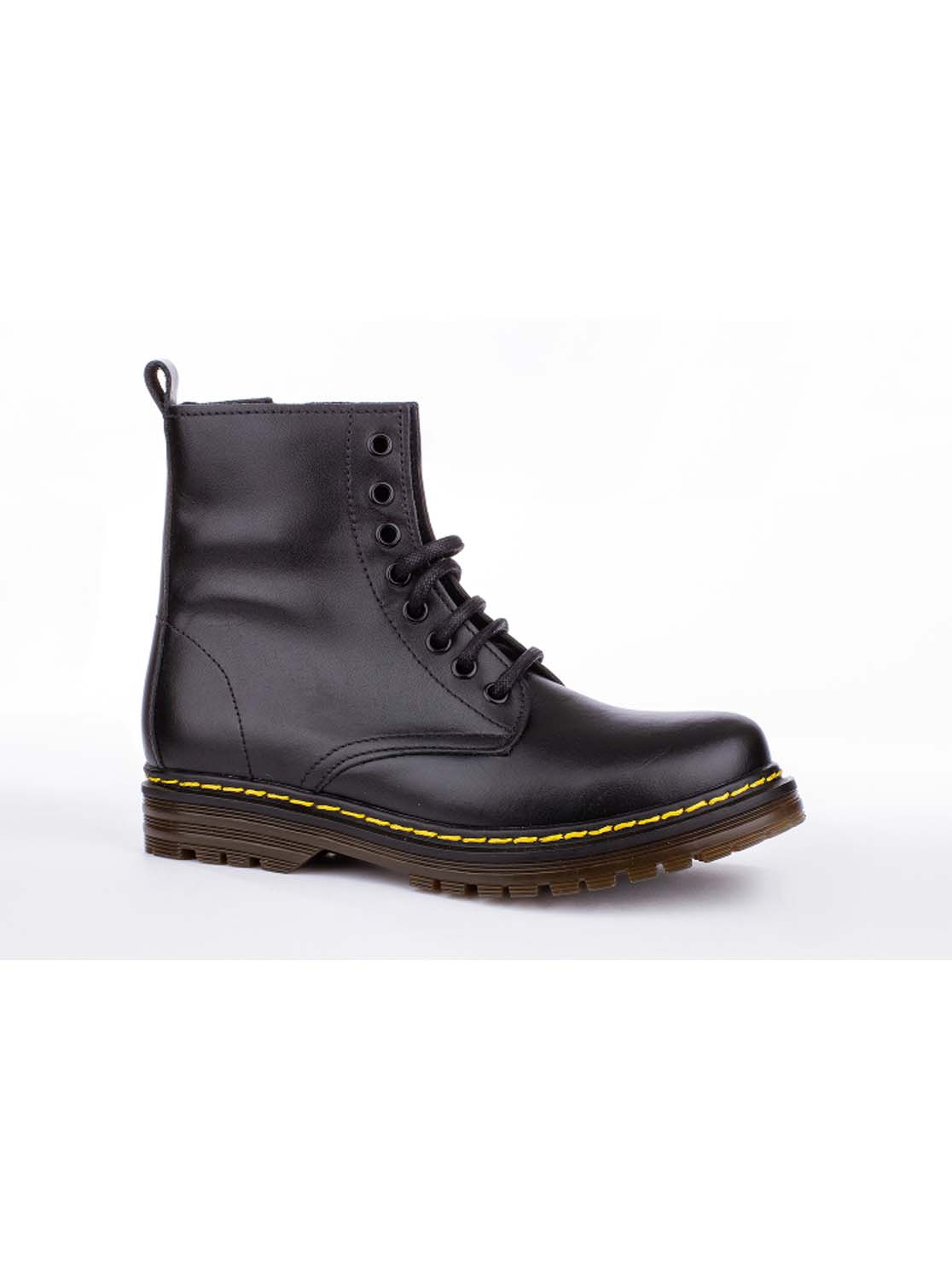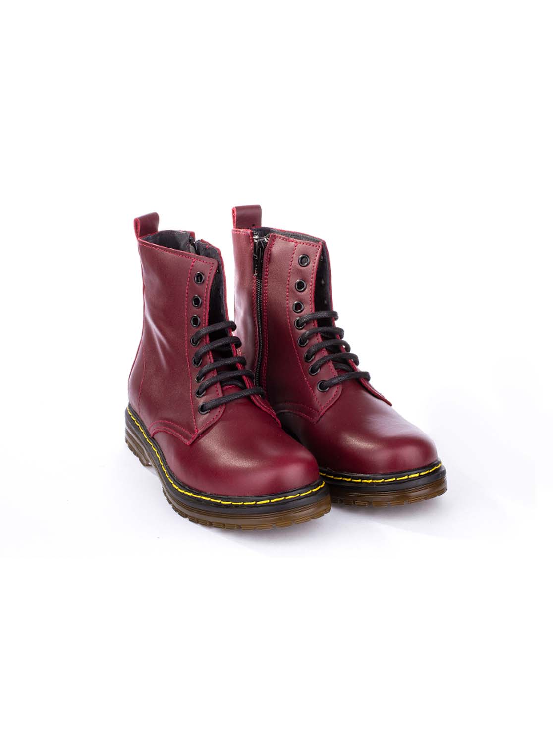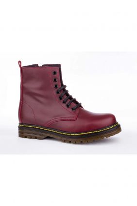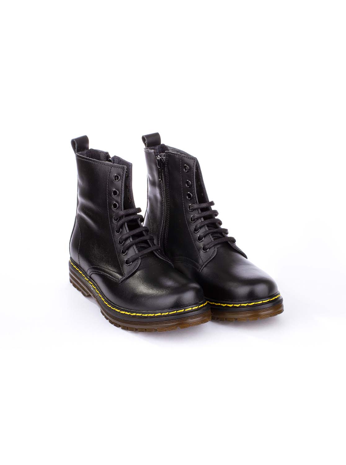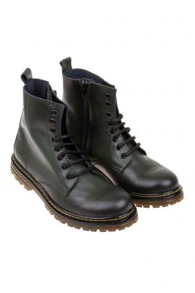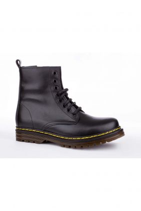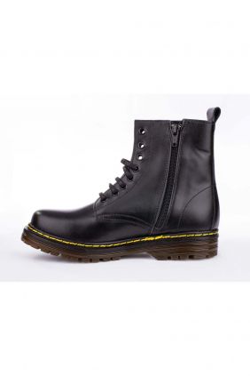 Bota estilo militar en piel. Cierre con cordones y cremallera. Todos los colores tienen el pespunte amarillo.