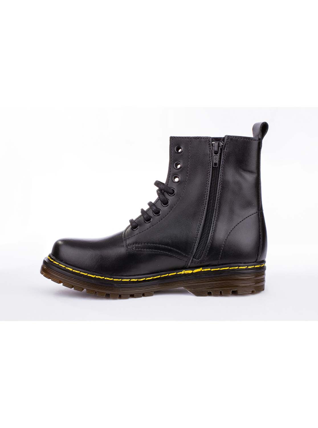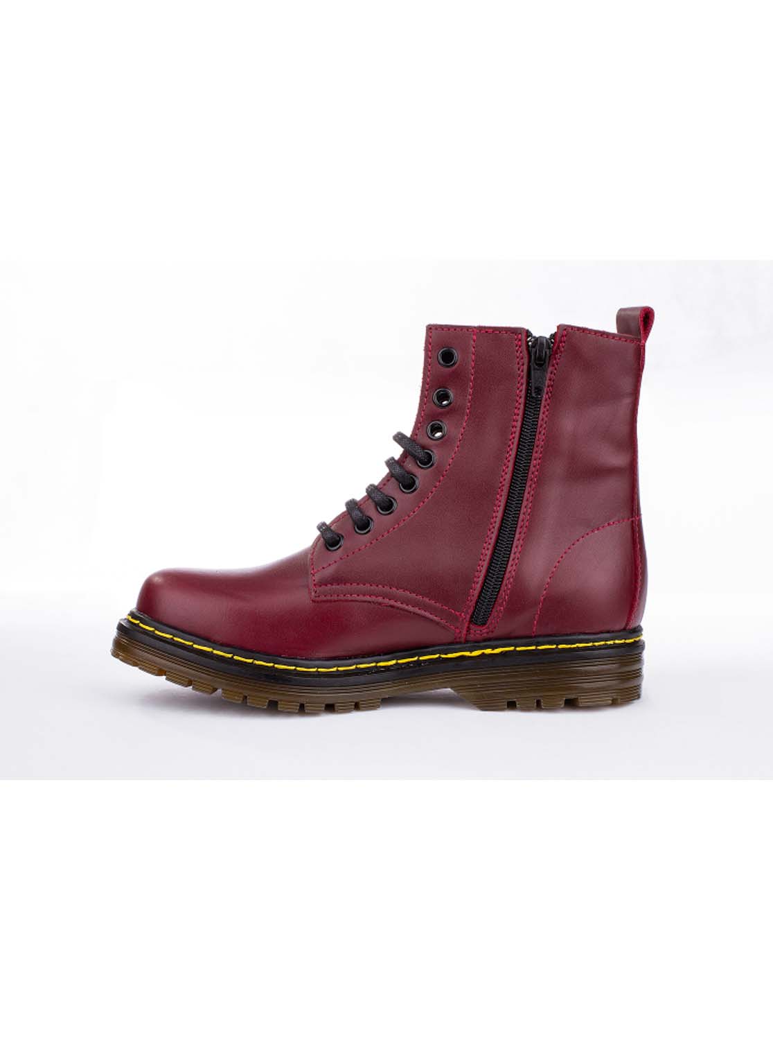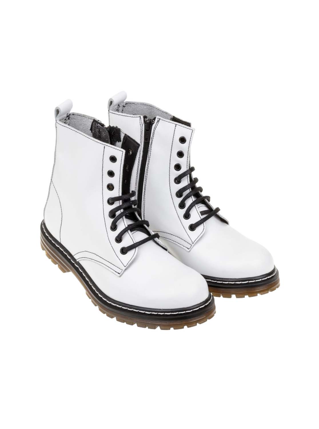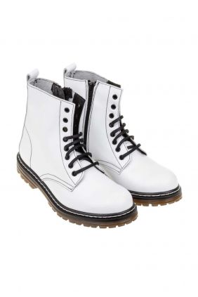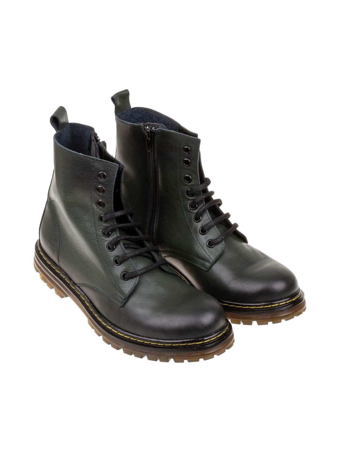 Bota estilo militar en piel. Cierre con cordones y cremallera. Todos los colores tienen el pespunte amarillo.