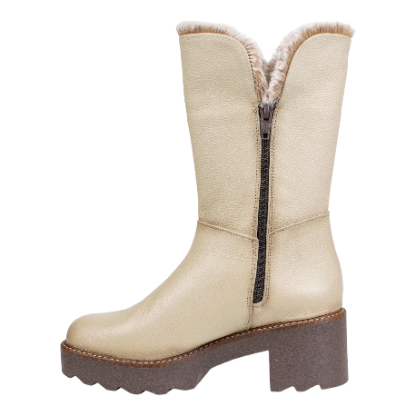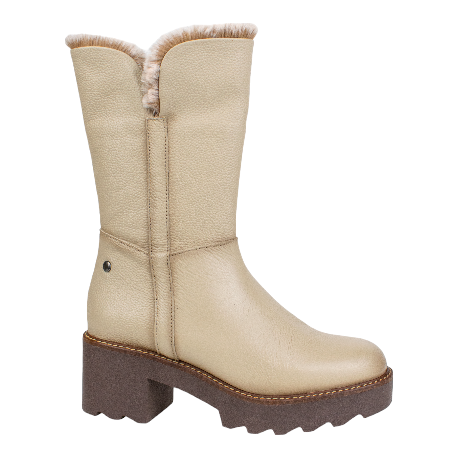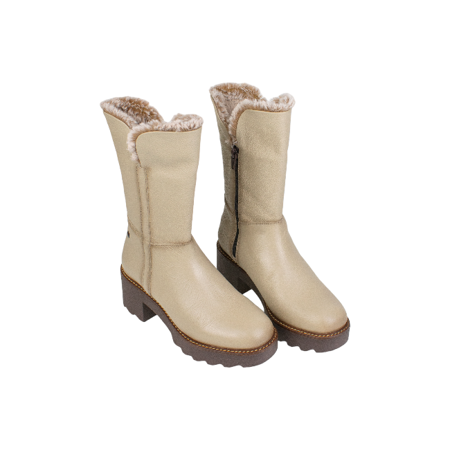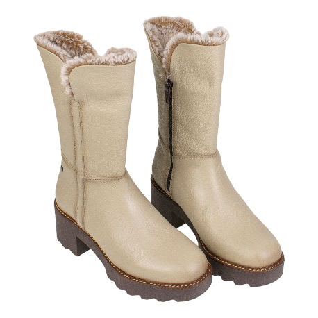 botas beige altas con un  estilo casual y moderno hechas en piel, marca Kaola, modelo 9325. Cuentan con piso y tacón track de 2.5-6 cm, cuello de pelo, forro de tela cálida y plantilla de piel. Hechas en España, son perfectas para combinar confort y estilo en cualquier ocasión. Calza normal. Altura de la caña(t.36): 23cm.