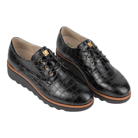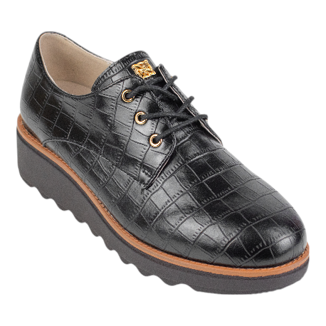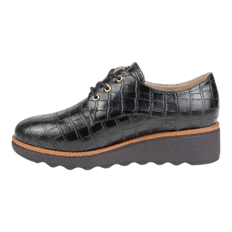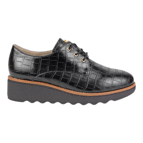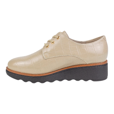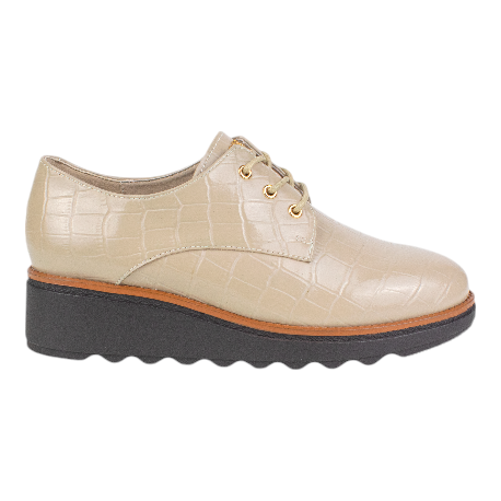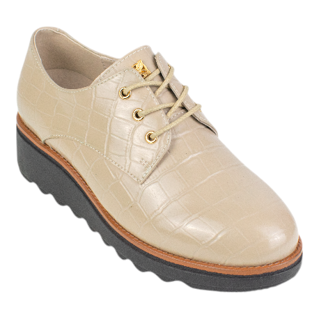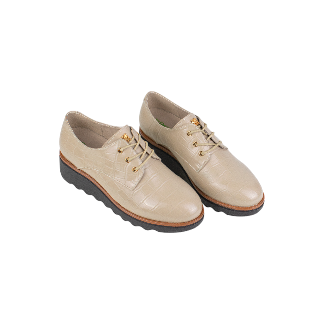 Descubre los elegantes zapatos con cuña  de piel con estampado coco de la línea ReNature de CHK10, modelo 27828.   Disponibles en sofisticados colores beis o negro, estos zapatos de cuña cuentan con un diseño moderno y versátil.   Su plantilla extraíble ofrece comodidad personalizada, mientras que los detalles dorados y los cordones añaden un toque de distinción.   Con una altura total de tacón de 4 cm, estos zapatos son perfectos para lucir estilizada sin sacrificar la comodidad. Ideales para cualquier ocasión, combina estilo y funcionalidad en cada paso.