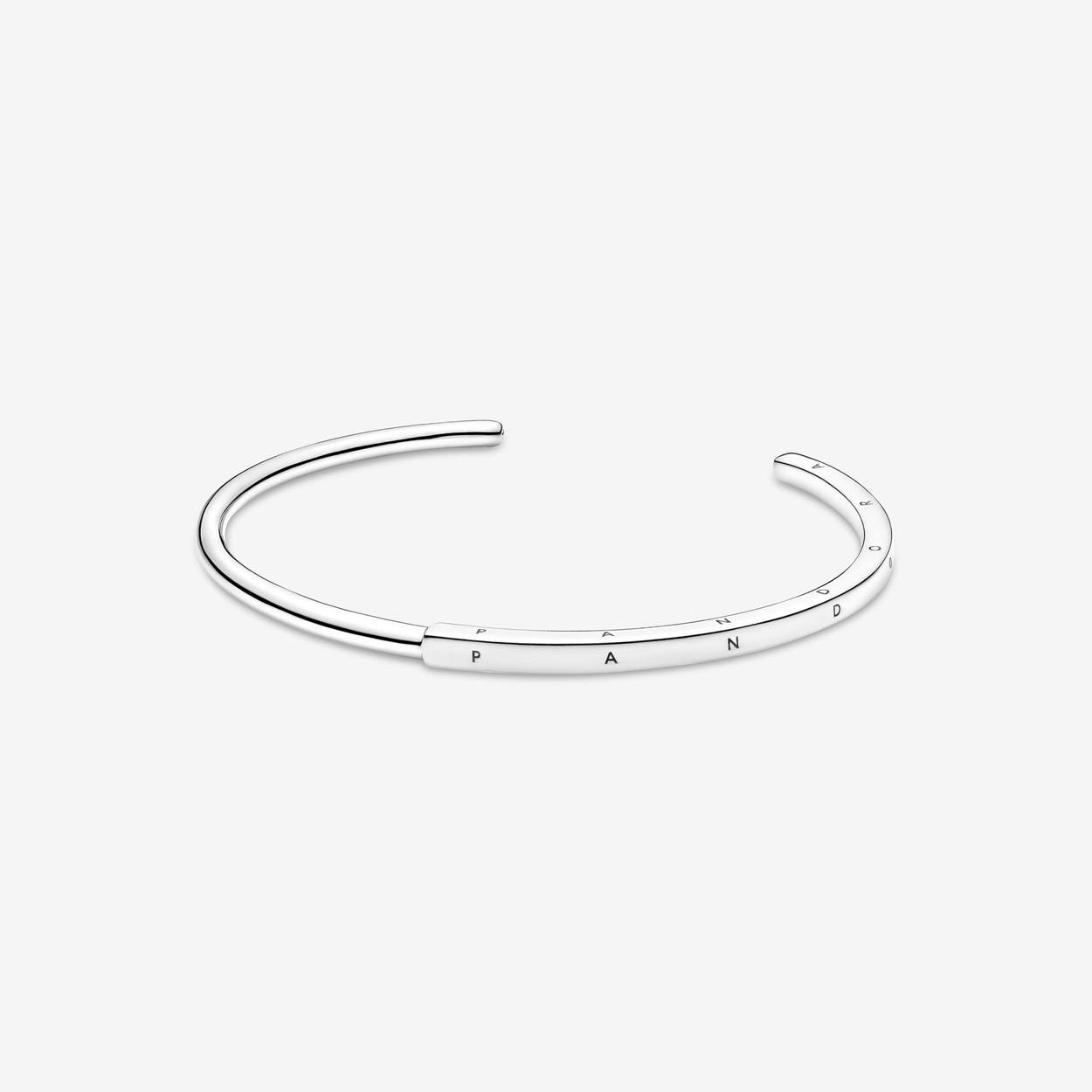 Eleva el tono de tu look con la Pulsera Rígida Pandora Signature I-D. Esta pulsera rígida, con un perfil semi-cuadrado y semi-redondo, se presenta acabada a mano en plata de primera ley. El perfil redondo pulido de la pulsera cambia en el centro a un perfil cuadrado de mayor tamaño cuyos tres laterales exteriores se han decorado con el logo de Pandora. Cada extremo de la pulsera rígida se ha embellecido con el monograma de la corona de la O de Pandora. La pulsera rígida ofrece un tamaño preciso que facilita un ajuste perfecto y no se ha diseñado para que sea necesario doblarla ni girarla al quitarla y ponerla.