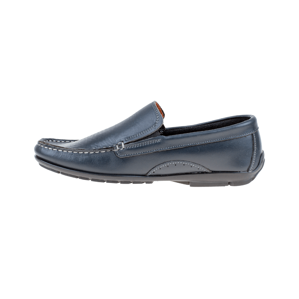 Marca Nel & Di. Modelo 7901 Zapatos de hombre estilo mocasín entero en piel, muy cómodo y blando perfecto para adaptarse a la anatomía del pie. Con dos gomitas laterales en el empeine para poder calzarlo mejor. En color azul marino, cuero y negro para combinar con cualquier cosa. Cosidos visibles. Piso fino de goma.