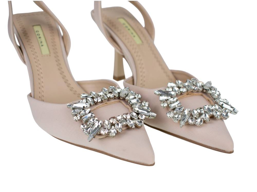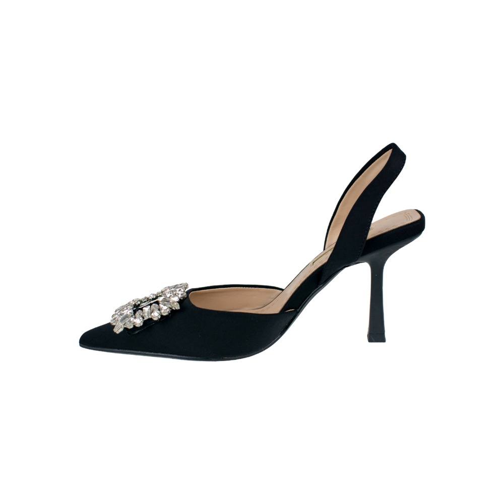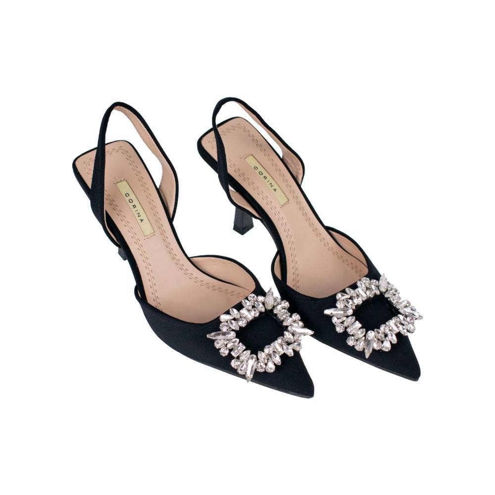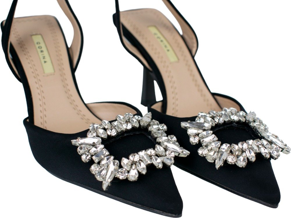 Precioso zapato de salón con detalle de joya(fantasía), fabricada en tela suave y de buena calidad; talón cuadrado descubierto con tira, ¡perfectos para combinar con tus prendas más elegantes! Tacón fino de 8 centímetros y punta fina. *Recomendamos elegir una talla menor a la habitual.
