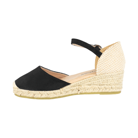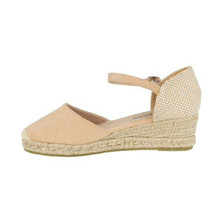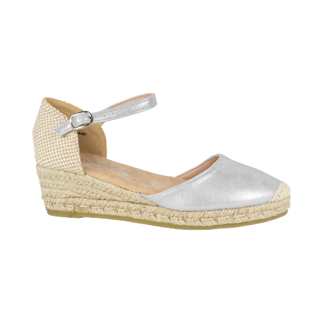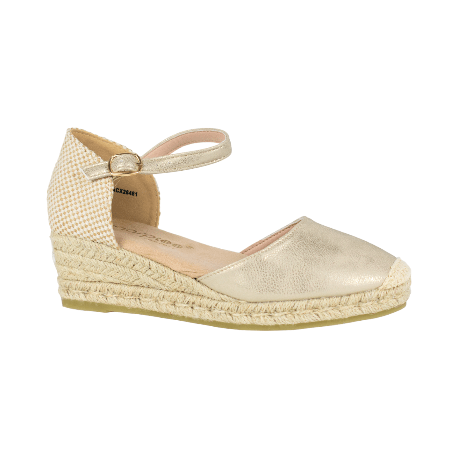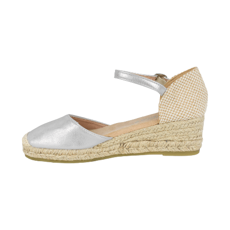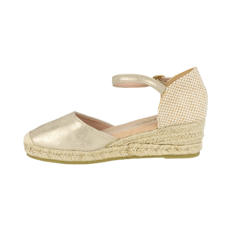 Cuña De Esparto Mujer Verano Tela Beis Dorado Negro y Plata 3 Cuerdas Con Correa Y Hebilla Amarpies ACX26481