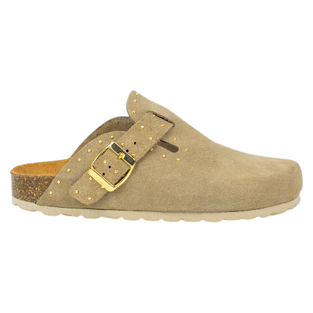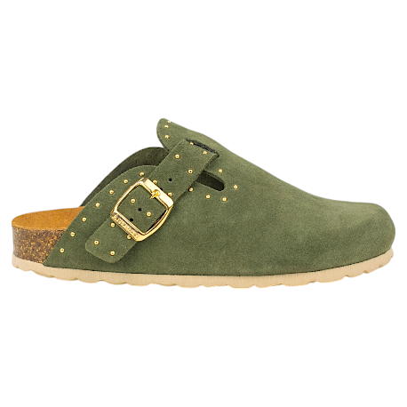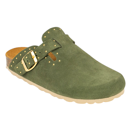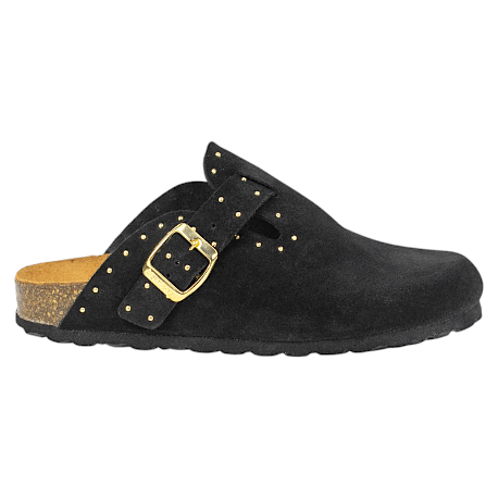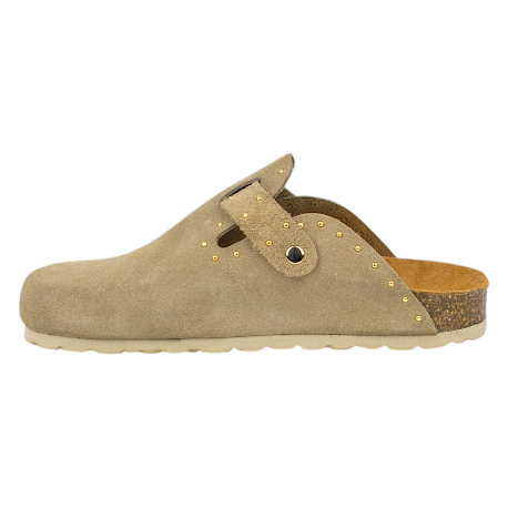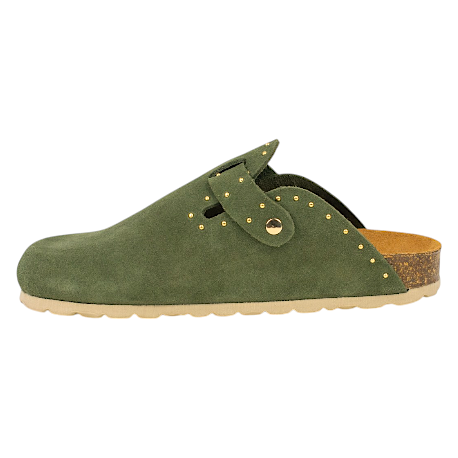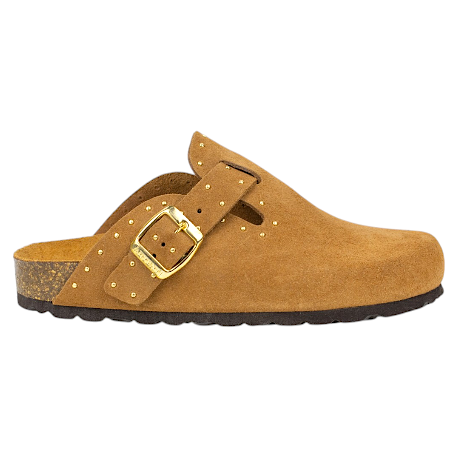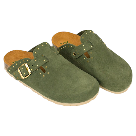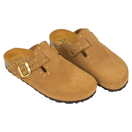 Zuecos fabricados enteramente en piel serraje de primera calidad, combinan el diseño clásico de este calzado con tachas doradas decorativas que le dan un toque más moderno . Su plantilla de acolchado carbónico se adapta a tu pie y aporta comodidad duradera. Este modelo está hecho en España por manos expertas. Calza normal.