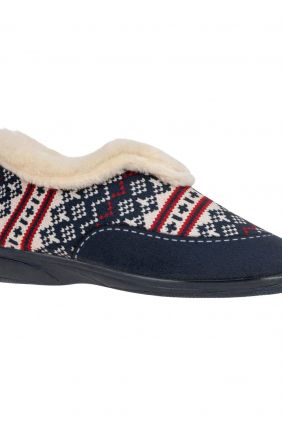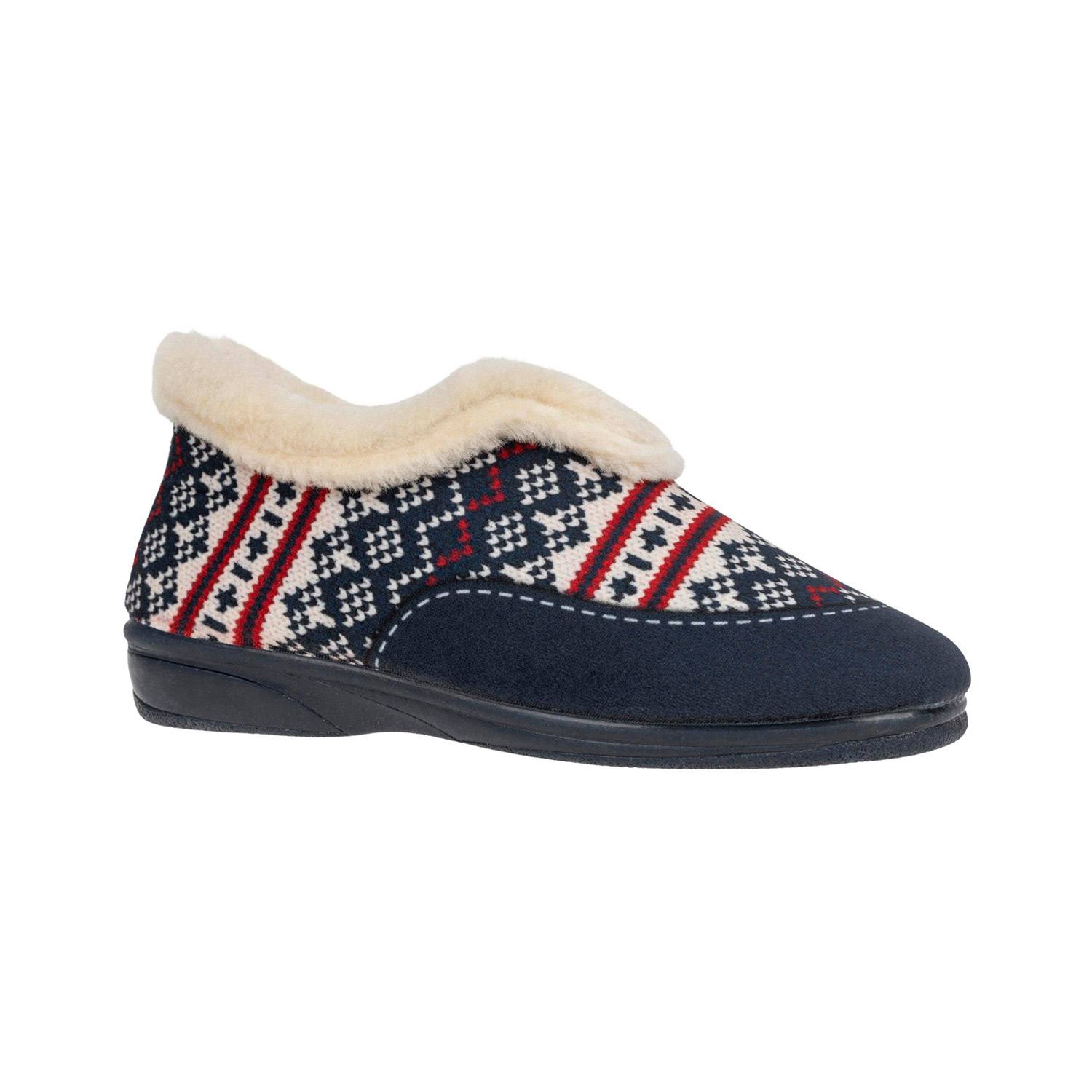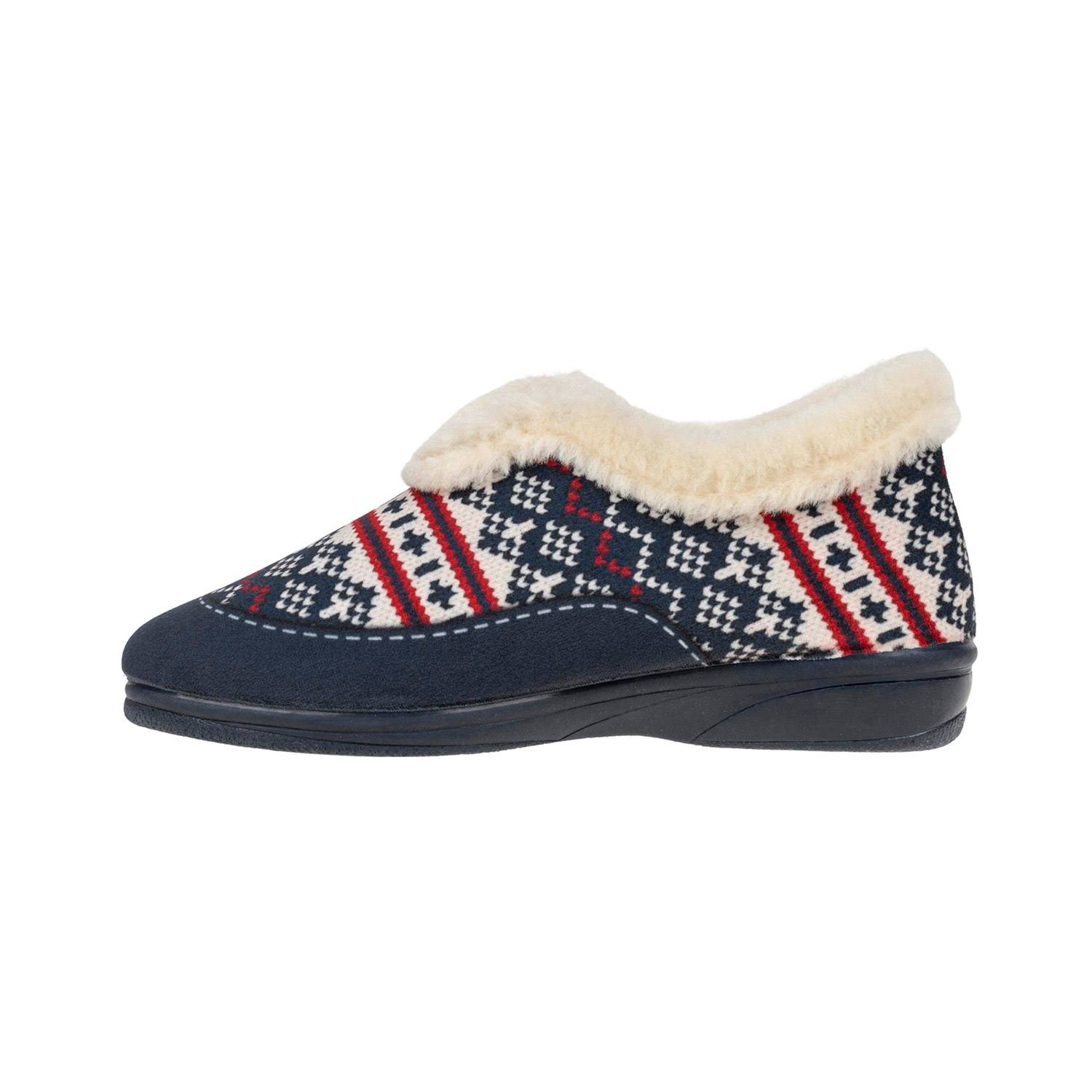 Zapatillas abotinadas de estar por casa con cuello de pelo y forro cálido para Invierno. Estampado nórdico en colores azul marino, rojo y blanco. Altura del tacón: 2.5cm. Flexible, suela resistente.