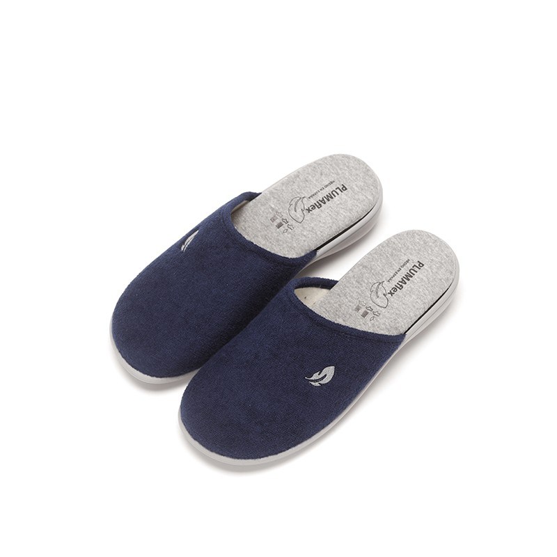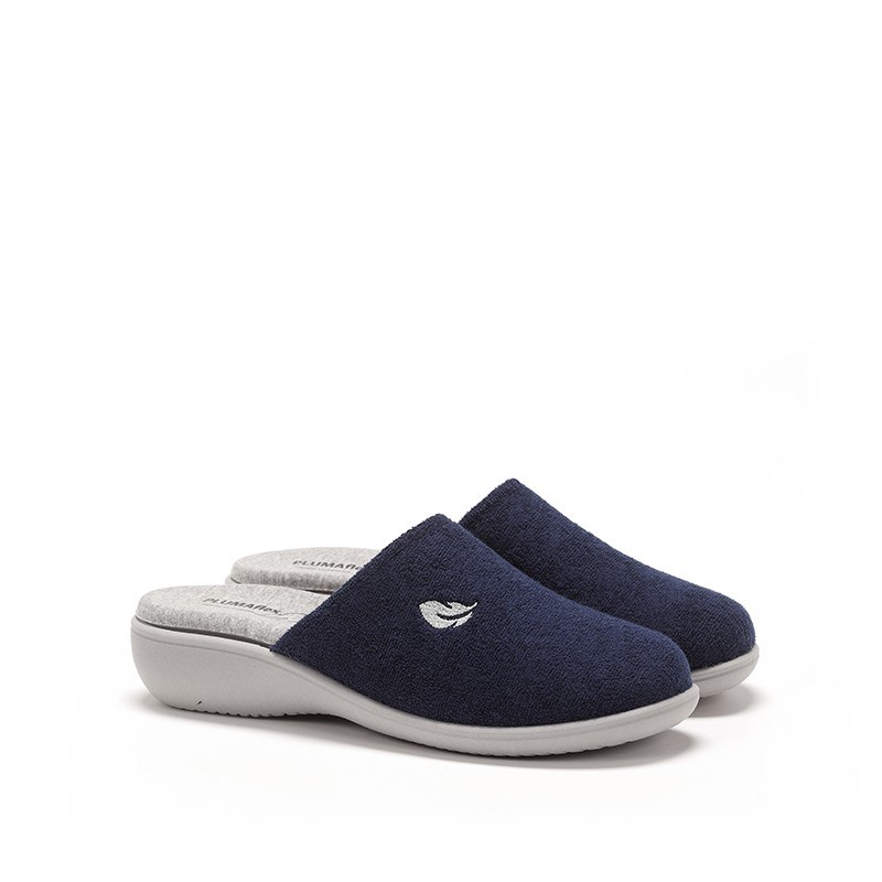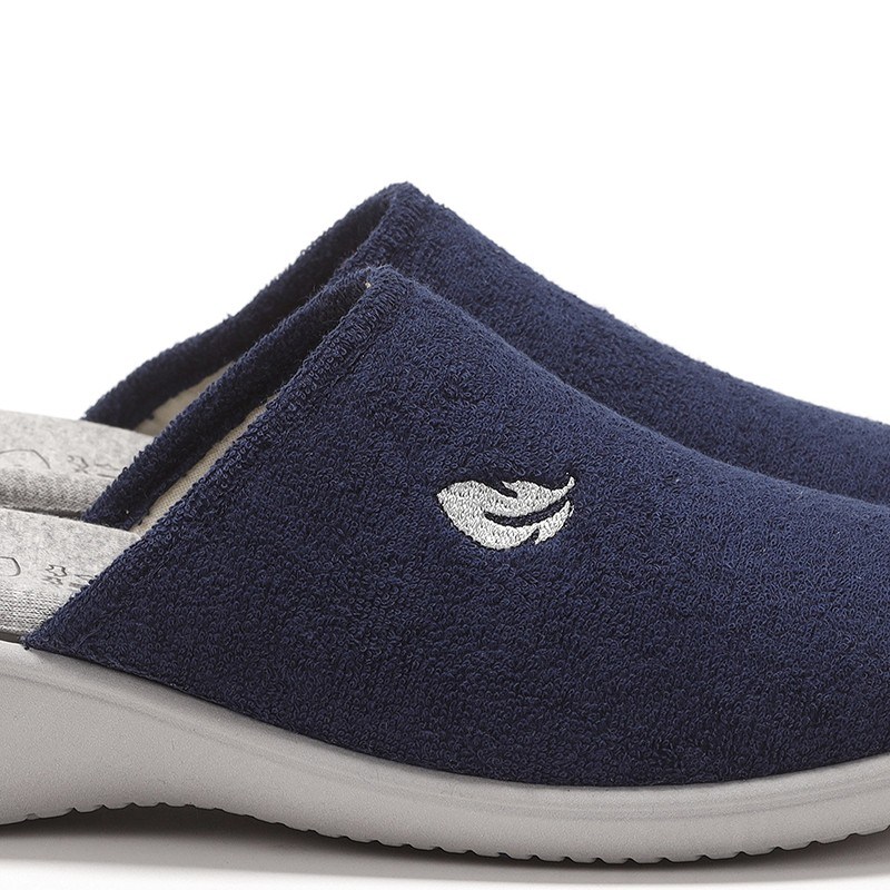 Zapatilla descalza para estar por casa de corte redondo, fabricada en rizo (algodón) muy fresco y transpirable. Disponible en color azul y azul marino. Muy cómodas gracias a su plantilla extraíble de espuma de PU, efecto memoria, que se adapta a la anatomía del pie. Cuenta con espacio óptimo en los dedos para mayor confort. Suela antideslizante de goma con cuña de 3.5cm. Hecho en España.